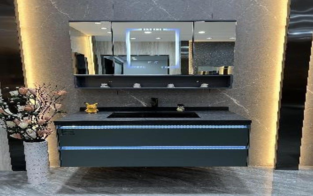 696 Подвесная тумба с раковиной и зеркальный шкаф со складной конструкцией Цельнокерамическая раковина с черной каменной плитой; Зеркальным шкафом с двойным стандартом и складной конструкцией.