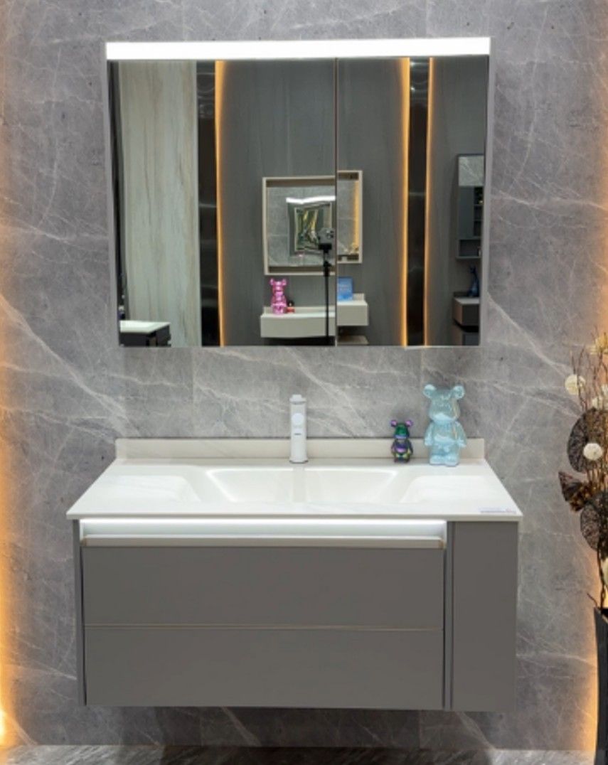 979 Элегантность и инновации: цельная раковина с термоогибом из каменной плиты, регулируемые открытые полки и умный зеркальный шкаф для вашего комфорта