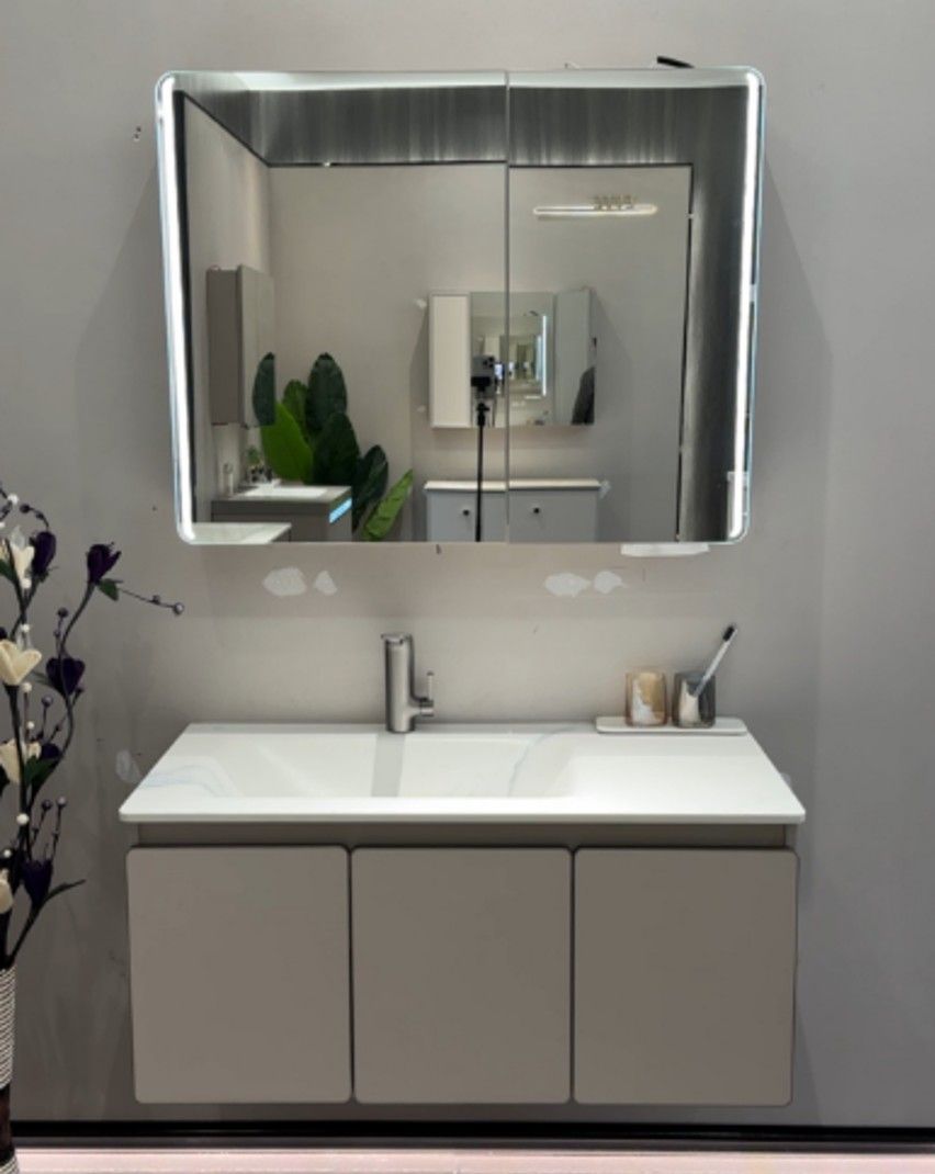 997 Современная элегантность: цельная раковина с изогнутым краем из каменной плиты, премиальная фурнитура и умный зеркальный шкаф для вашего комфорта