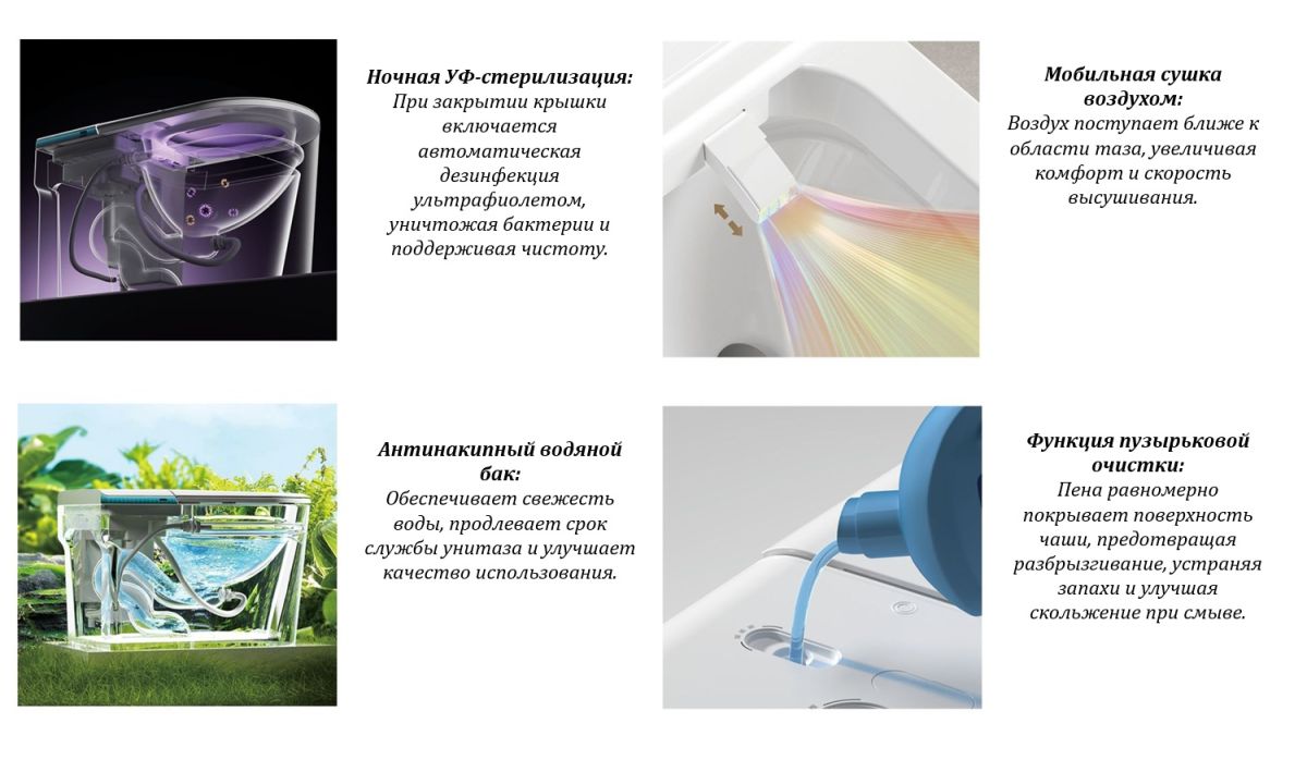 Функция пузырьковой очистки - пена равномерно покрывает поверхность чаши, предотвращая разбрызгивание, устраняя запахи и улучшая скольжение при смыве.