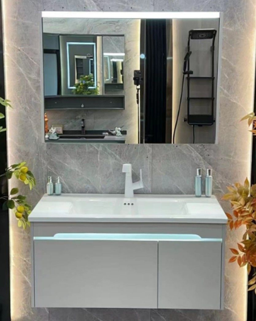 Цельная керамическая раковина, импортная фурнитура и сенсорная подсветка с управлением взмахом руки — идеальный выбор для стильной ванной с комфортом и технологиями.