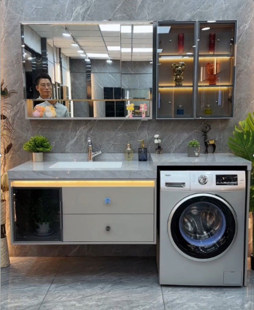 L2 Подвесная тумба с раковиной, зеркальный шкаф и столешницей для стиральной машины. Цельнокерамическая раковина с бесшовной отделкой из каменной плиты; Подставка для стиральной машины, с возможностью взаимозаменяемости с обеих сторон. - 60см * 130см; - 60см * 140см; - 60см * 150см; - 60см * 160см; - 60см * 170см. Смеситель и сливная система в комплектацию не входят! Внимание: керамическая цельная раковина может быть больше на 1–2 см.
