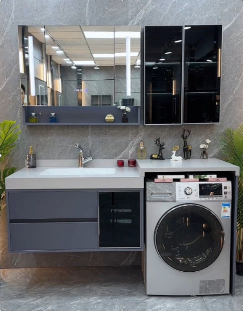 L5 Подвесная тумба с раковиной, зеркальный шкаф и столешницей для стиральной машины. Цельнокерамическая раковина с бесшовной отделкой из каменной плиты; Подставка для стиральной машины, с возможностью взаимозаменяемости с обеих сторон. - 60см * 130см; - 60см * 140см; - 60см * 150см; - 60см * 160см; - 60см * 170см. Смеситель и сливная система в комплектацию не входят! Внимание: керамическая цельная раковина может быть больше на 1–2 см.